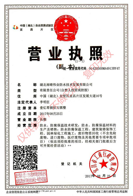 雨晴偉業(yè)在集團(tuán)公司“致力卓越、見證未來”的強(qiáng)勢理念下,立志做到“雨晴偉業(yè),晴朗世界”;立志研發(fā)“別無我有,別有我優(yōu)”的優(yōu)質(zhì)差異化產(chǎn)品;立志成為高品質(zhì)防水系統(tǒng)引領(lǐng)者,為人類解除滲漏之苦,呵護(hù)人類安居生活!