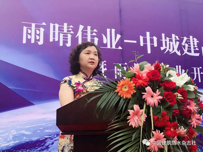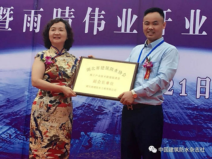 隨后,湖北防水協(xié)會(huì)會(huì)長桂春芳女士代表湖北防水協(xié)會(huì)在開業(yè)慶典大會(huì)上發(fā)表重要講話,她對(duì)湖北雨晴由最開始的施工企業(yè)轉(zhuǎn)型為防水系統(tǒng)服務(wù)商的工程進(jìn)行了簡要介紹,并對(duì)之前雨晴承接的眾多國家大型、重點(diǎn)項(xiàng)目的防水工程予以肯定,并對(duì)雨晴在湖北乃至華中地區(qū)較高知名度,美譽(yù)度,影響力予以了肯定。她還說:當(dāng)前,高質(zhì)量發(fā)展是新時(shí)代的要求,也是防水行業(yè)新時(shí)代的使命,并希望雨晴集團(tuán)在產(chǎn)品質(zhì)量、工程質(zhì)量和服務(wù)質(zhì)量的管理上進(jìn)一步做深做透做細(xì),日益精進(jìn)。心無旁騖造產(chǎn)品、一絲不茍干工程、全心全意做服務(wù),使雨晴集團(tuán)快速進(jìn)入高質(zhì)量高效益發(fā)展的康莊大道。之后授予雨晴公司“湖北省建筑防水協(xié)會(huì)施工產(chǎn)業(yè)技術(shù)聯(lián)盟促進(jìn)會(huì)副會(huì)長單位”。